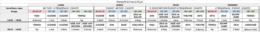 Planning de la période 5 :