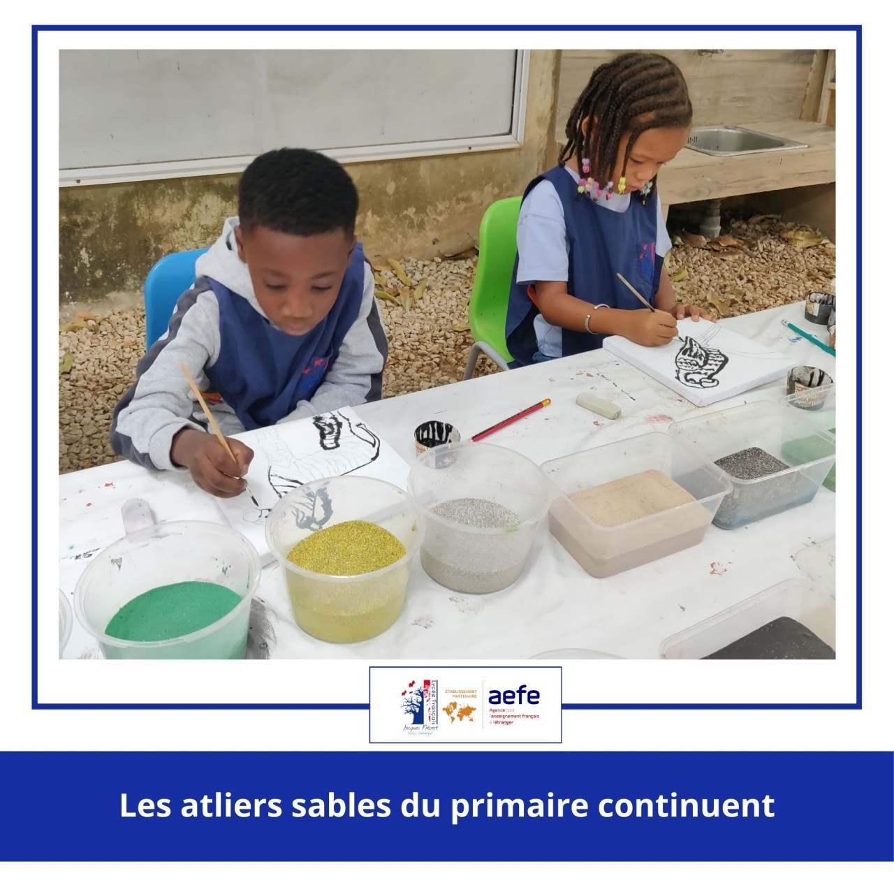 Au Lycée français Jacques Prévert de Saly, les ateliers sables, inspirés d’une technique artistique traditionnelle du Sénégal, continuent de faire découvrir aux élèves la richesse des pratiques plastiques locales.
