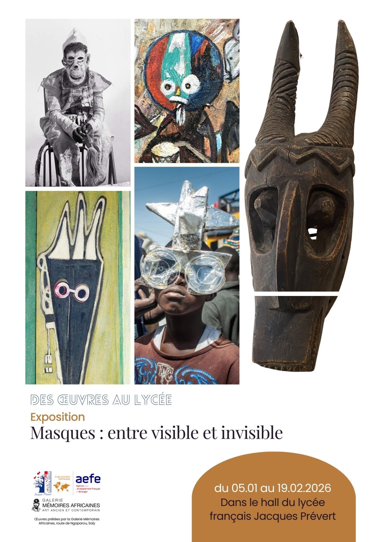 Pour cette nouvelle période, le lycée français Jacques Prévert propose une exposition d’œuvres d’art dans le hall du lycée, invitant élèves, personnels et visiteurs à découvrir et interroger la figure du masque à travers différentes formes artistiques.